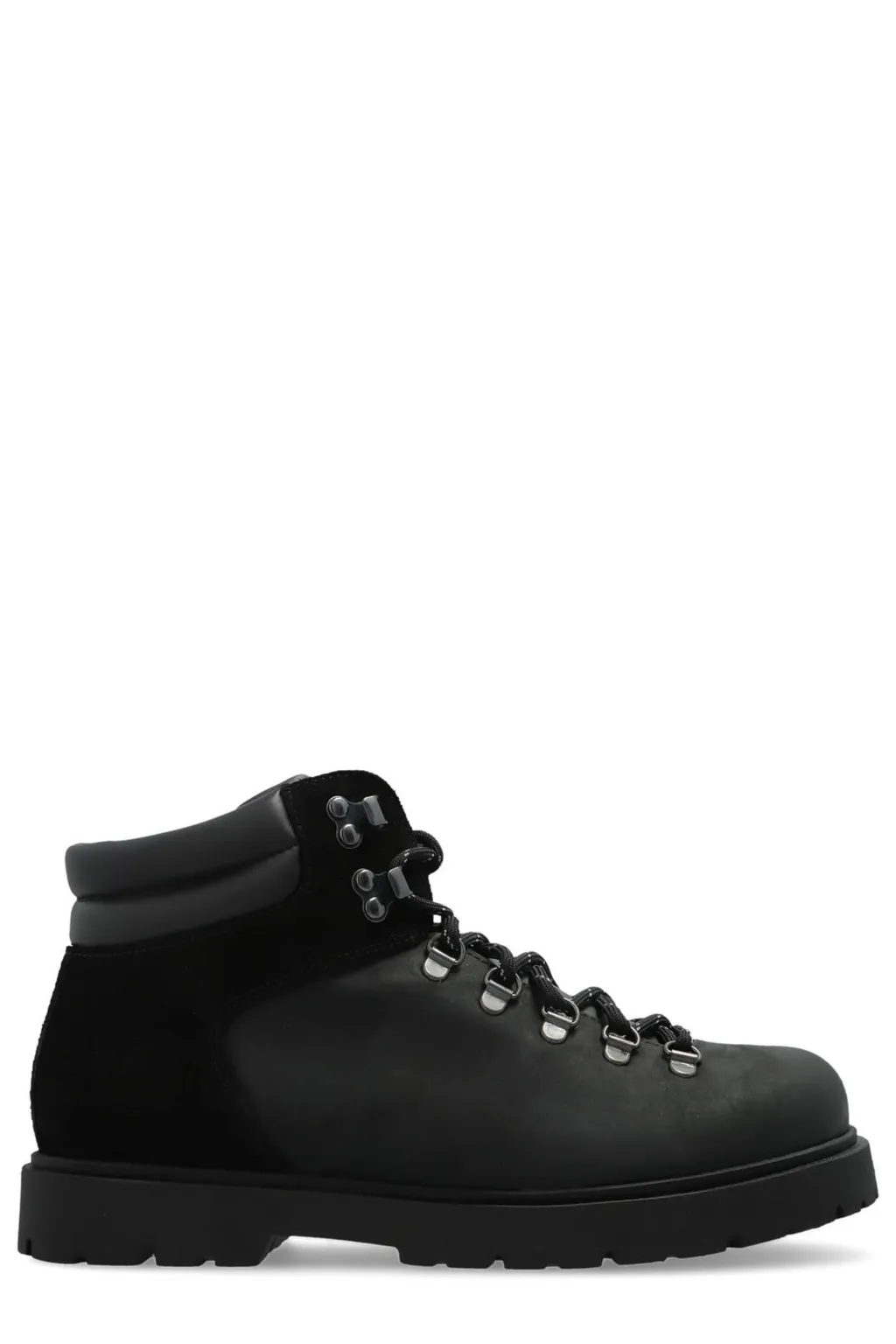 A pair of black leather and suede hiking boots with a lace-up closure and a thick rubber sole. The boots have a padded collar and ankle support.
