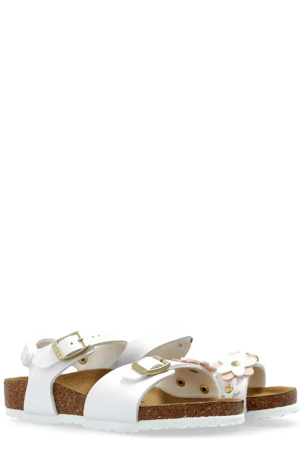 White sandals with a cork sole and two adjustable straps with buckles. One strap features a decorative pink flower.
