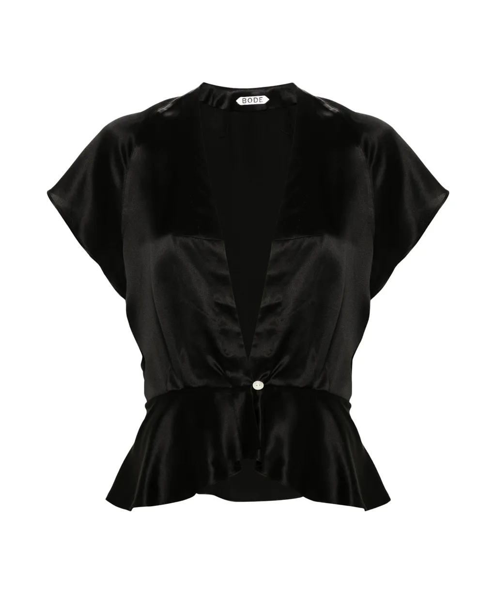 Silk short-sleeved shirt with a v-neckline and ruffled hem. Features an oversized button closure at the waist.