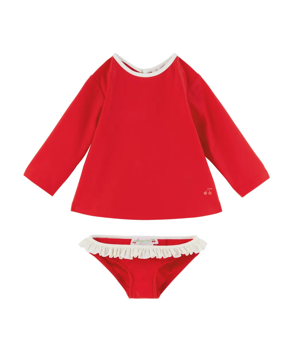 Top: round neck with logo printed on the hem. Swimming trunks: elastic belt decorated with flounces.