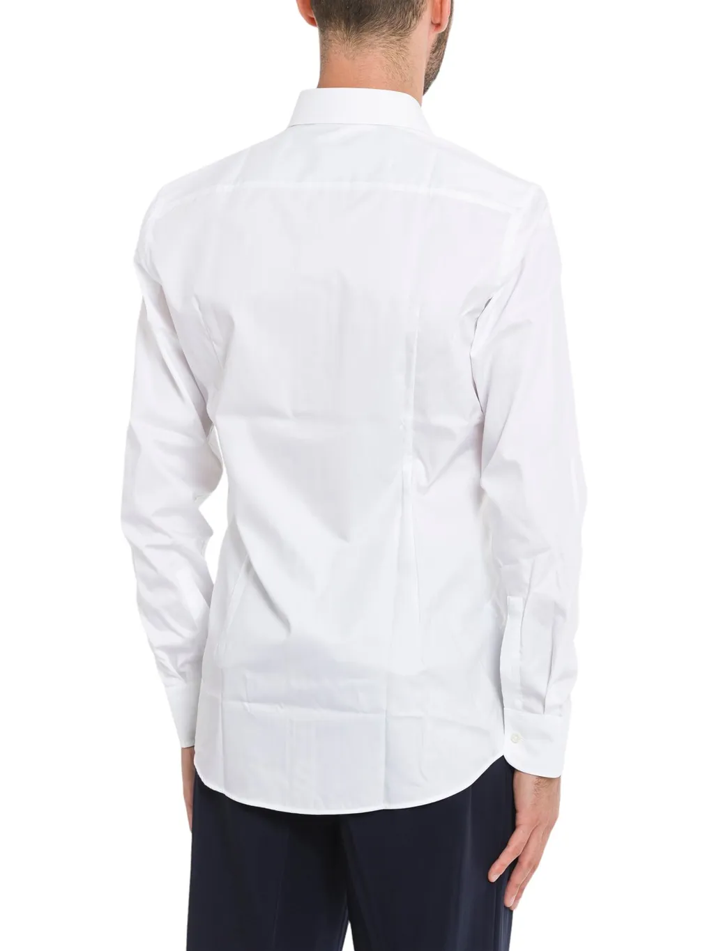 A classic white button-down shirt with a pointed collar and long sleeves. It features a button-up front and a tailored fit.