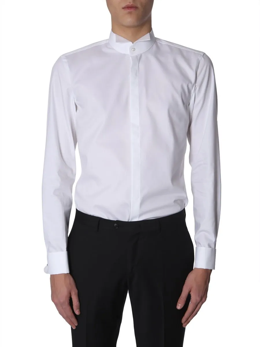 A long-sleeved white formal shirt with a band collar and a concealed button placket. The shirt features a central pleat detail on the front and buttoned cuffs. It is designed to be worn with formal attire.