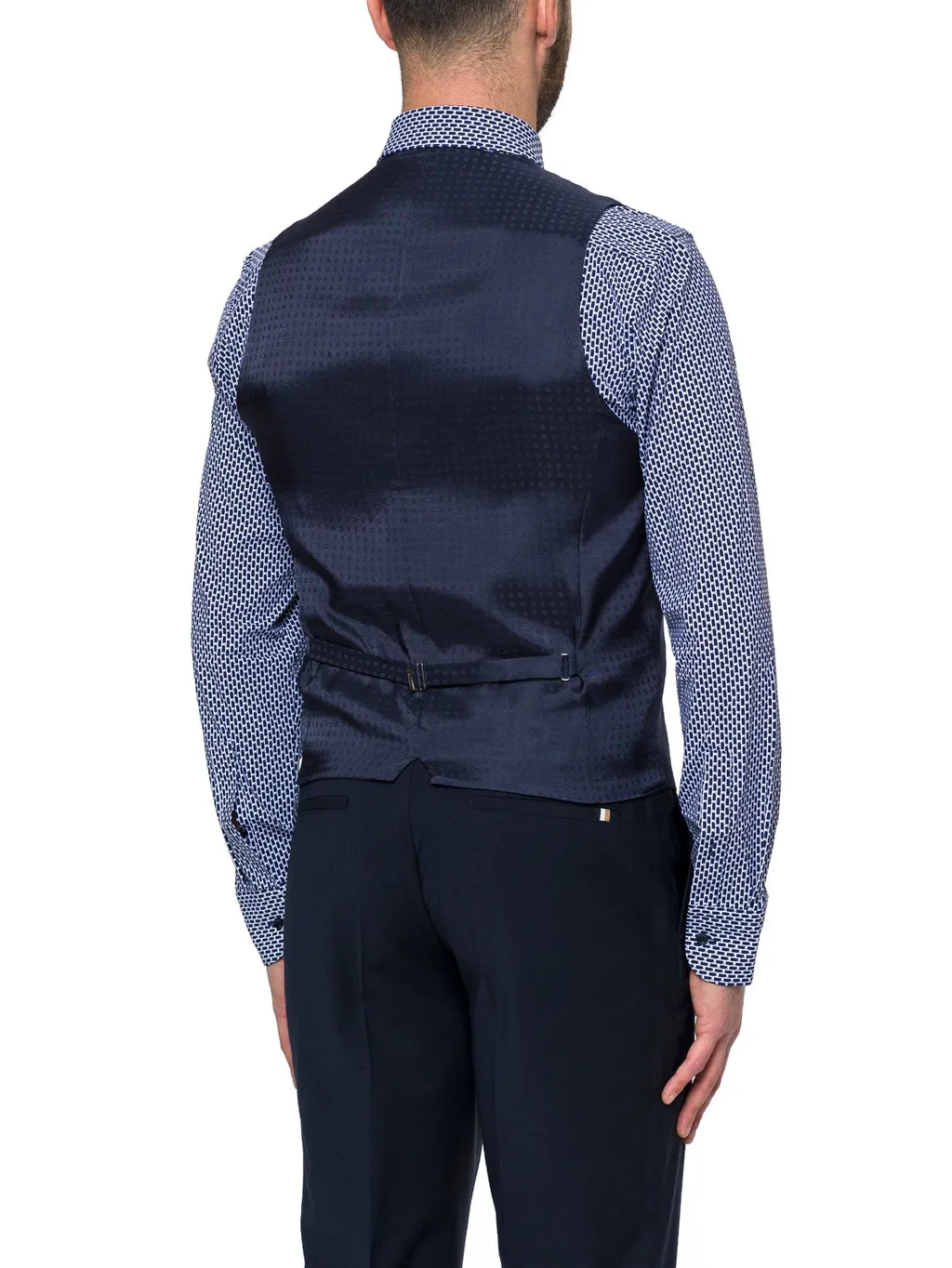 A navy blue vest with a v-neck and a button-up front. The vest has a smooth finish and a tailored fit, designed to be worn over a patterned shirt.