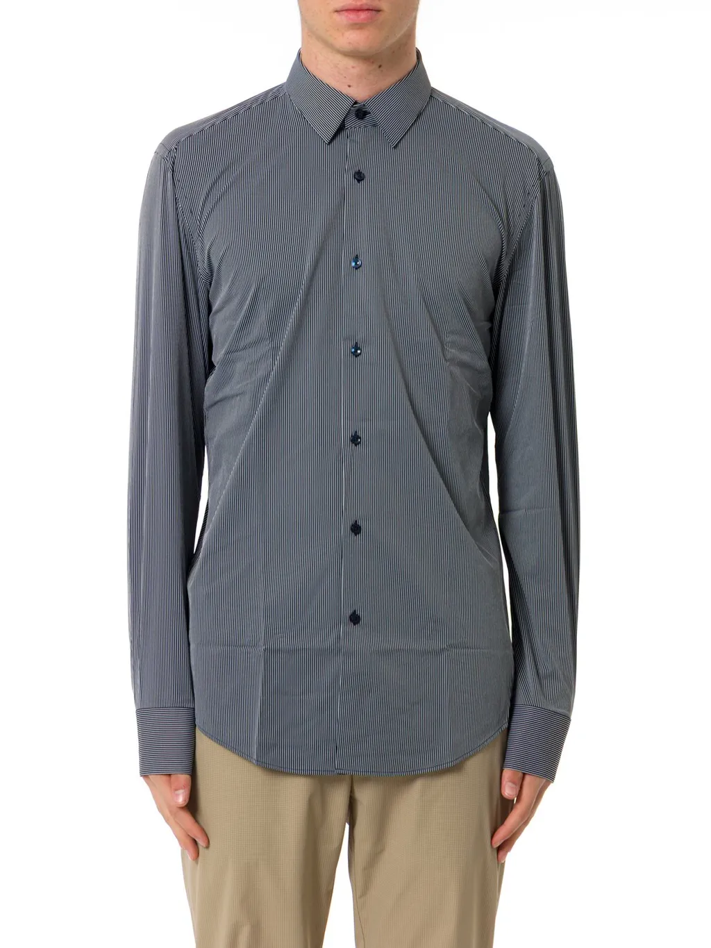 A men's long-sleeved button-down shirt with a fine pinstripe pattern. It features a classic collar, a button-up front, and buttoned cuffs. The shirt has a tailored fit.