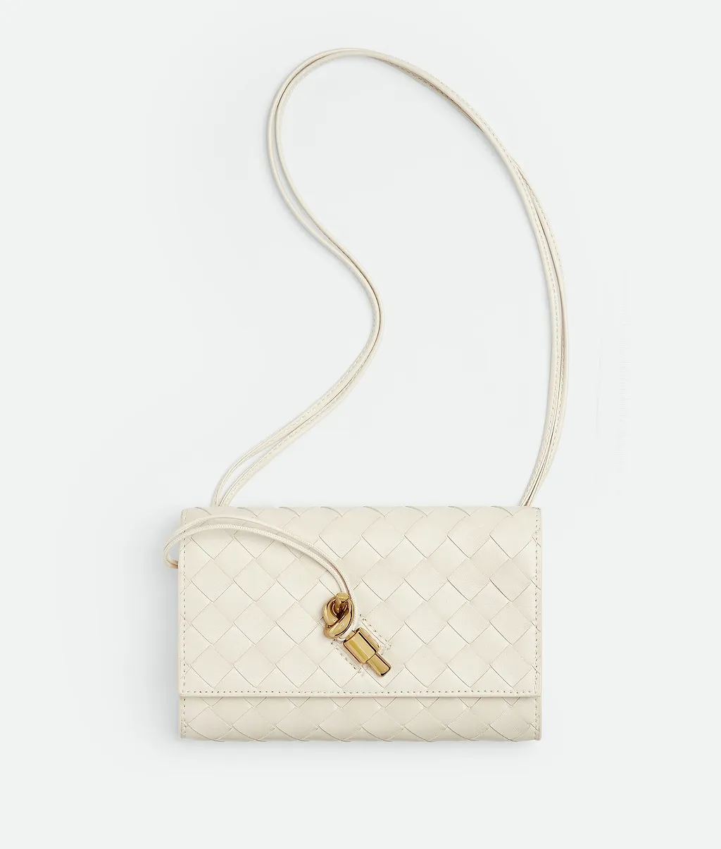 Description• intrecciato nappa leather pouch<br>• one main compartment, two card slots<br>• metal knot closure<br>• sliding leather strap<br><br>• lining: calfskin<br>• colour: sea salt<br>• hardware: muse brass finish<br>• height: 12.6 cm | 5"<br>• width: 19 cm | 7.5"<br>• depth: 2 cm | 0.8"<br>• strap drop: 55 cm | 21.7"