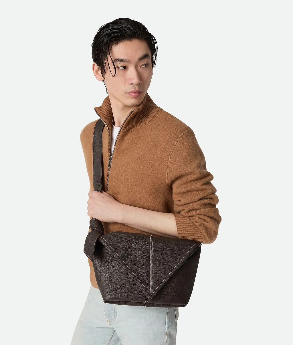 Description• small shoulder in grained calf leather with contrasted stitching<br>• strap adjustable with a knot<br>• one interior zipped pocket<br>• for instructions on how to knot the strap, see the enclosed leaflet<br>• flap closure<br><br>• lining: suede<br>• color: fondant<br>• hardware: silver finish<br>• height: 17 cm | 6.7"<br>• width: 25 cm | 9.8"<br>• depth: 12 cm | 4.7"