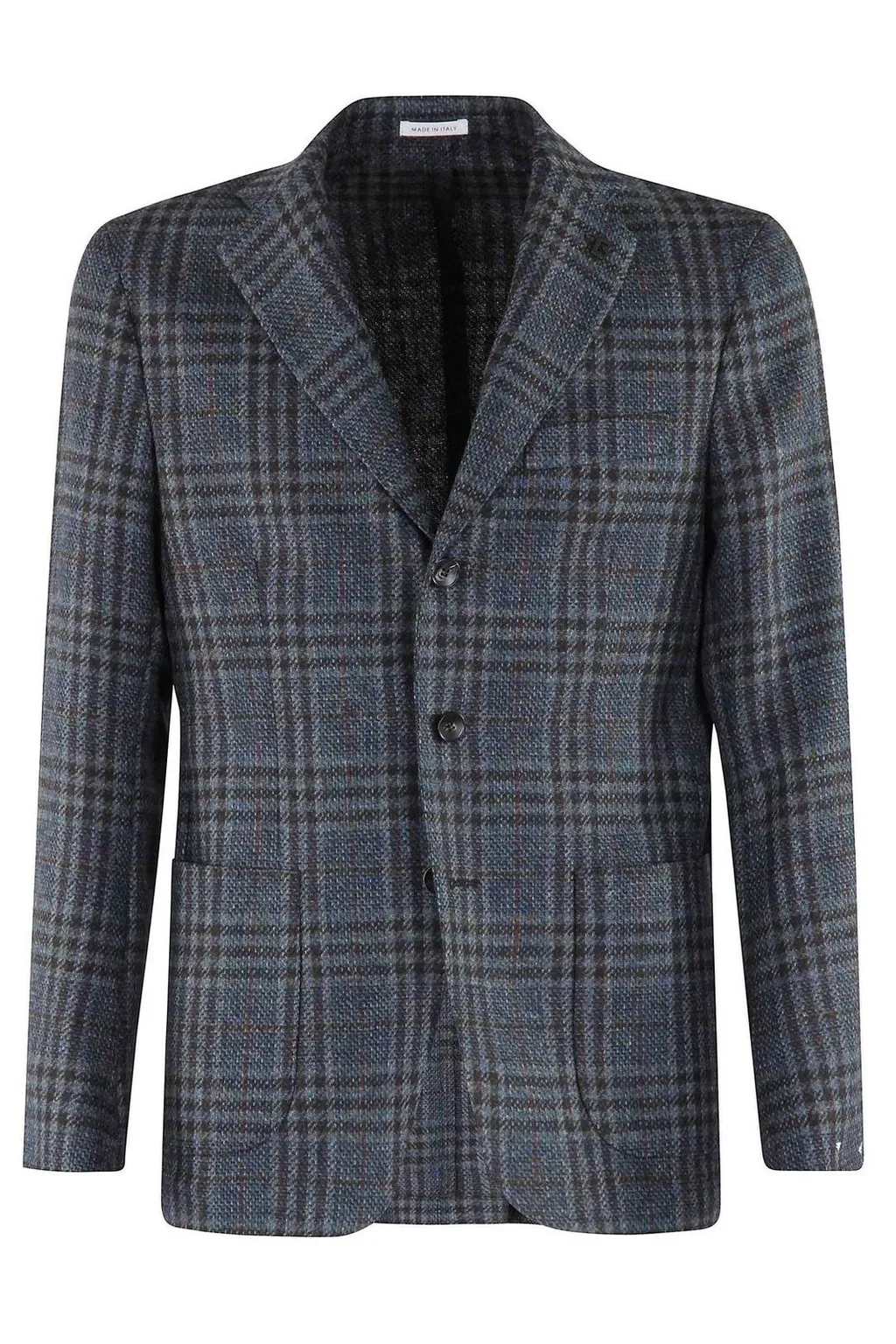 A men's blazer featuring a classic plaid pattern. It has a notched lapel, two-button closure, and two front flap pockets. The back is plain with no vents visible.