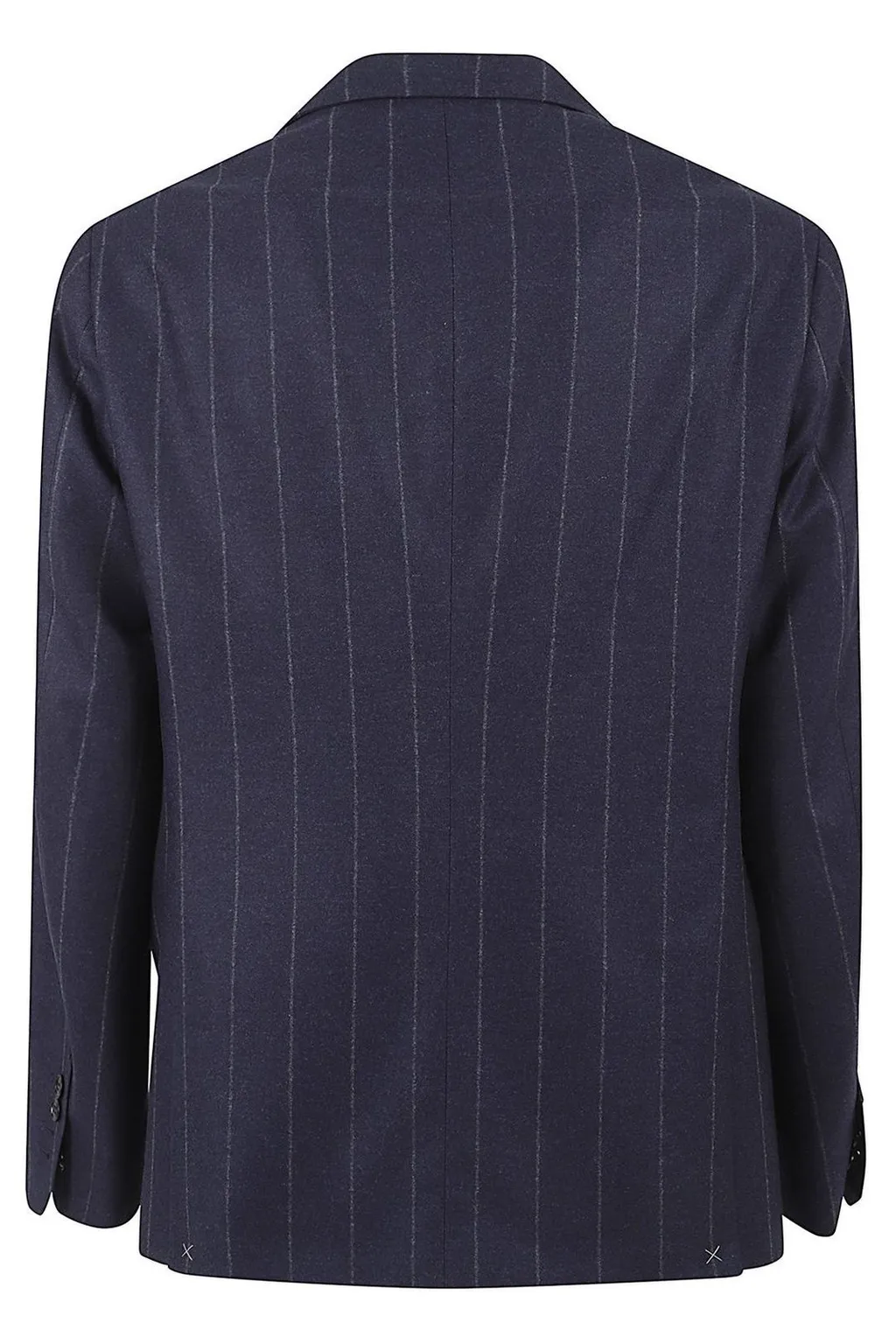 A classic navy pinstripe suit jacket with a notched lapel and two-button closure. Features two flap pockets and a single chest pocket. The jacket is fully lined.