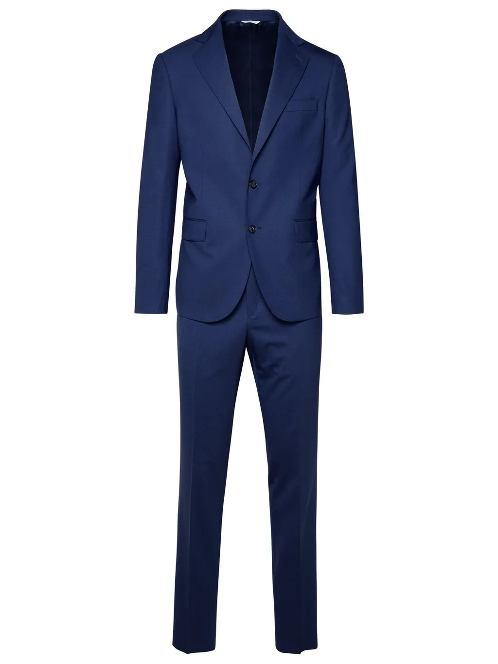 A two-piece suit in a classic navy blue. The jacket features a notched lapel, two-button closure, and two flap pockets. The trousers are straight-leg with a flat front.