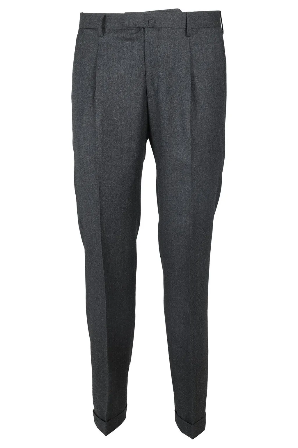Men's grey trousers with a classic fit. They feature a pleated front, belt loops, and a cuffed hem. The back has two welt pockets.