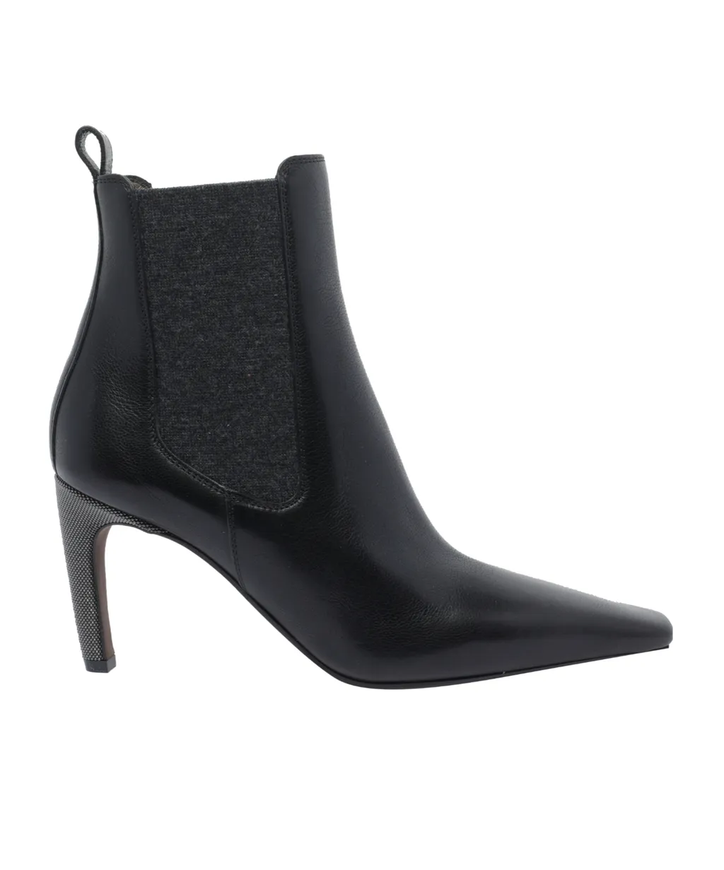 High-heeled chelsea boots with rear shoe lifting rings.