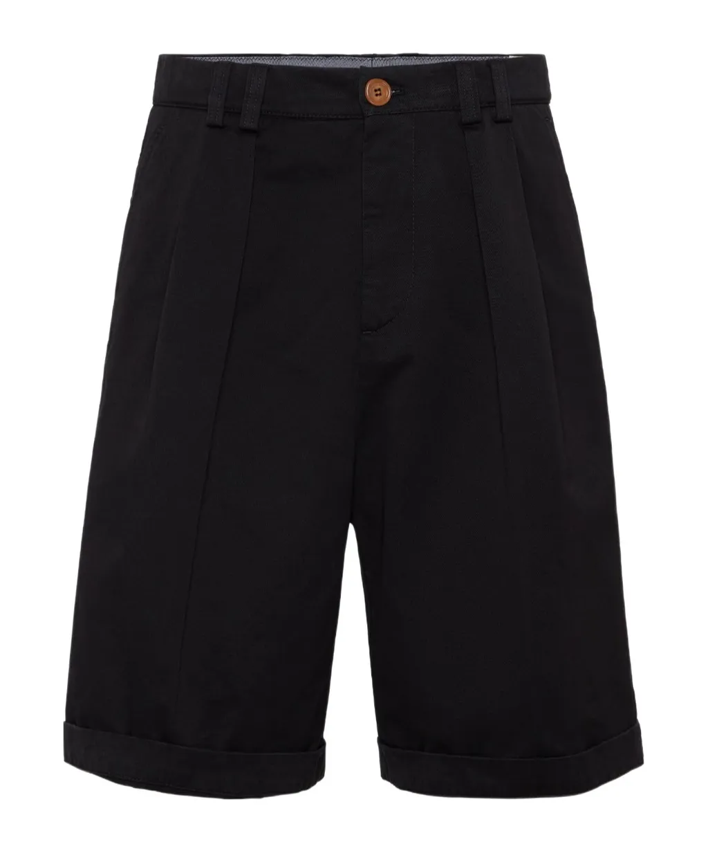 DescriptionThese shorts feature fold details, belt loops, an invisible placket with button opening and closing, diagonal pockets on both sides, two rear covered pockets, straight legs, a flanged hem, and a knee length.