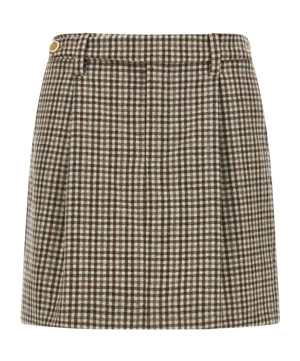 Skirt with belt loops and a checked pattern.