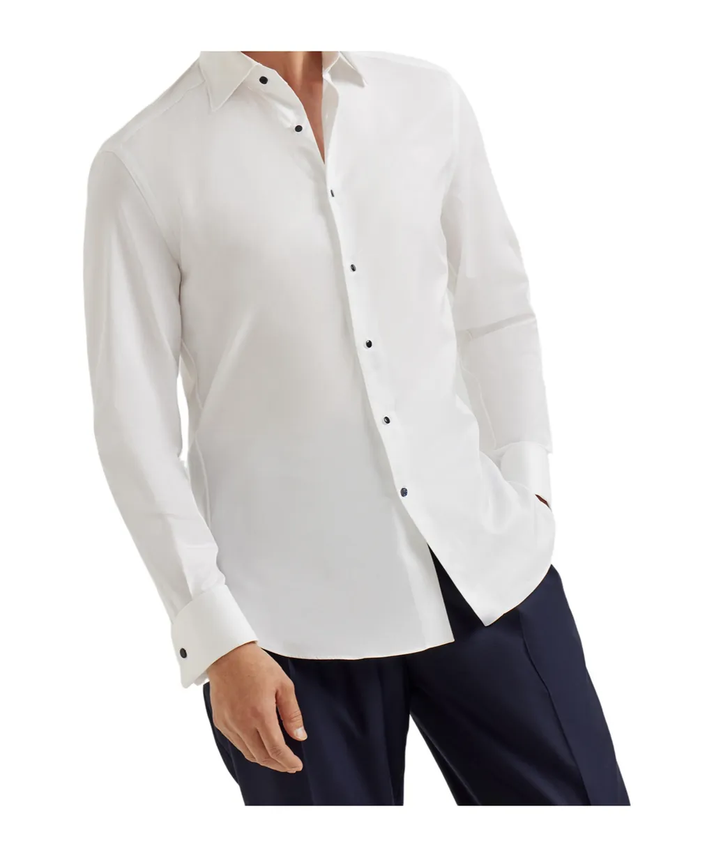 Button closure, wide corner collar, double french cuffs, slim cut. Single row buttons. Regular fit.