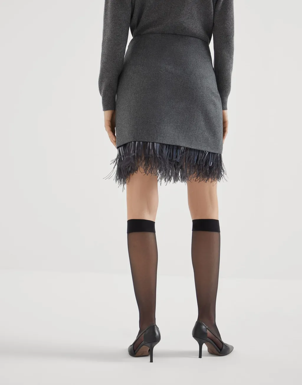 Mini skirt with a medium waist, rear hidden zipper, and thigh length. Features feather trim.