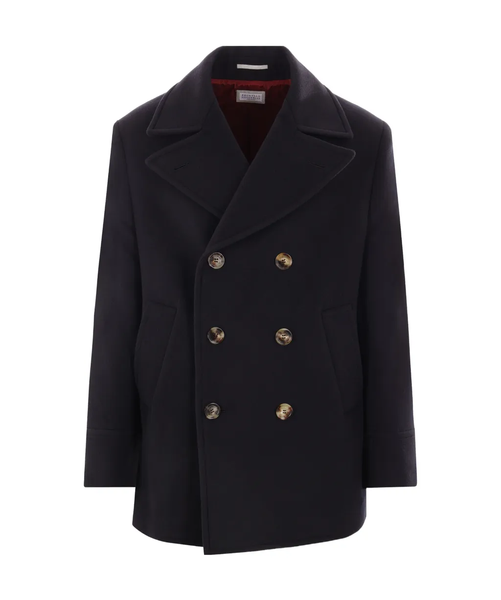 DescriptionCoat with wide-notched lapels, double-breasted closure, long sleeves, two diagonal pockets on the sides, and internal pockets. Features a double row of buttons. Designed for a loose, regular fit.