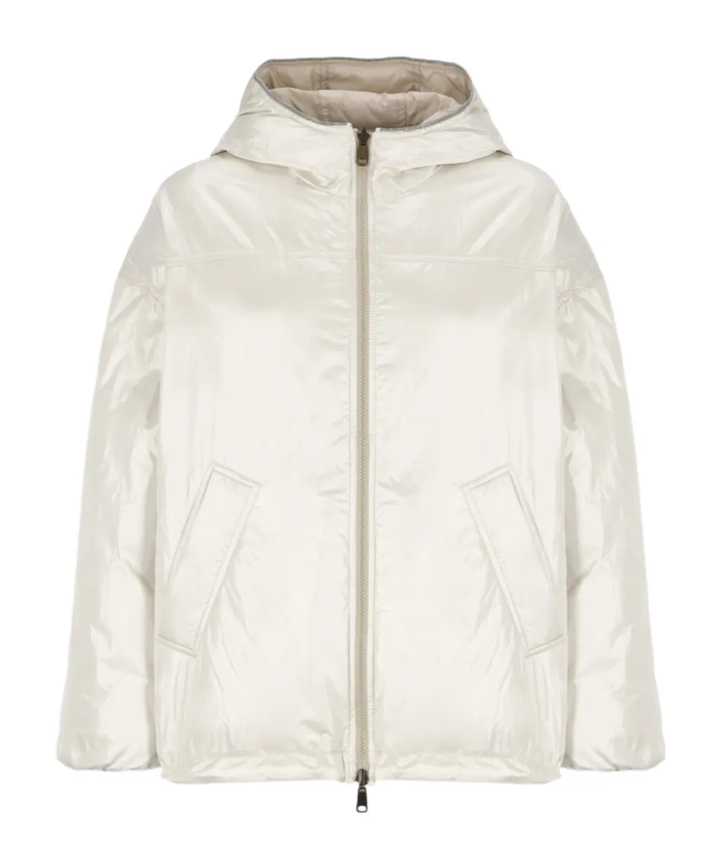 DescriptionHooded jacket with long sleeves, elastic cuffs, and an elastic hem with a drawstring. Features two front snap pockets and a front zipper closure. The jacket is reversible and can be worn on both sides. Regular fit.