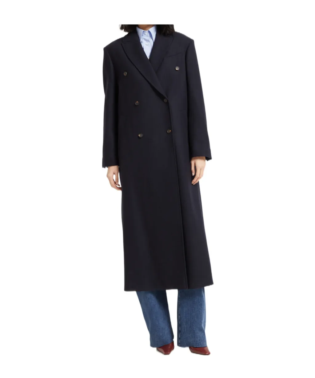 Long sleeves, double-breasted, pocket design. Double row of buttons. Regular fit, mid-length.