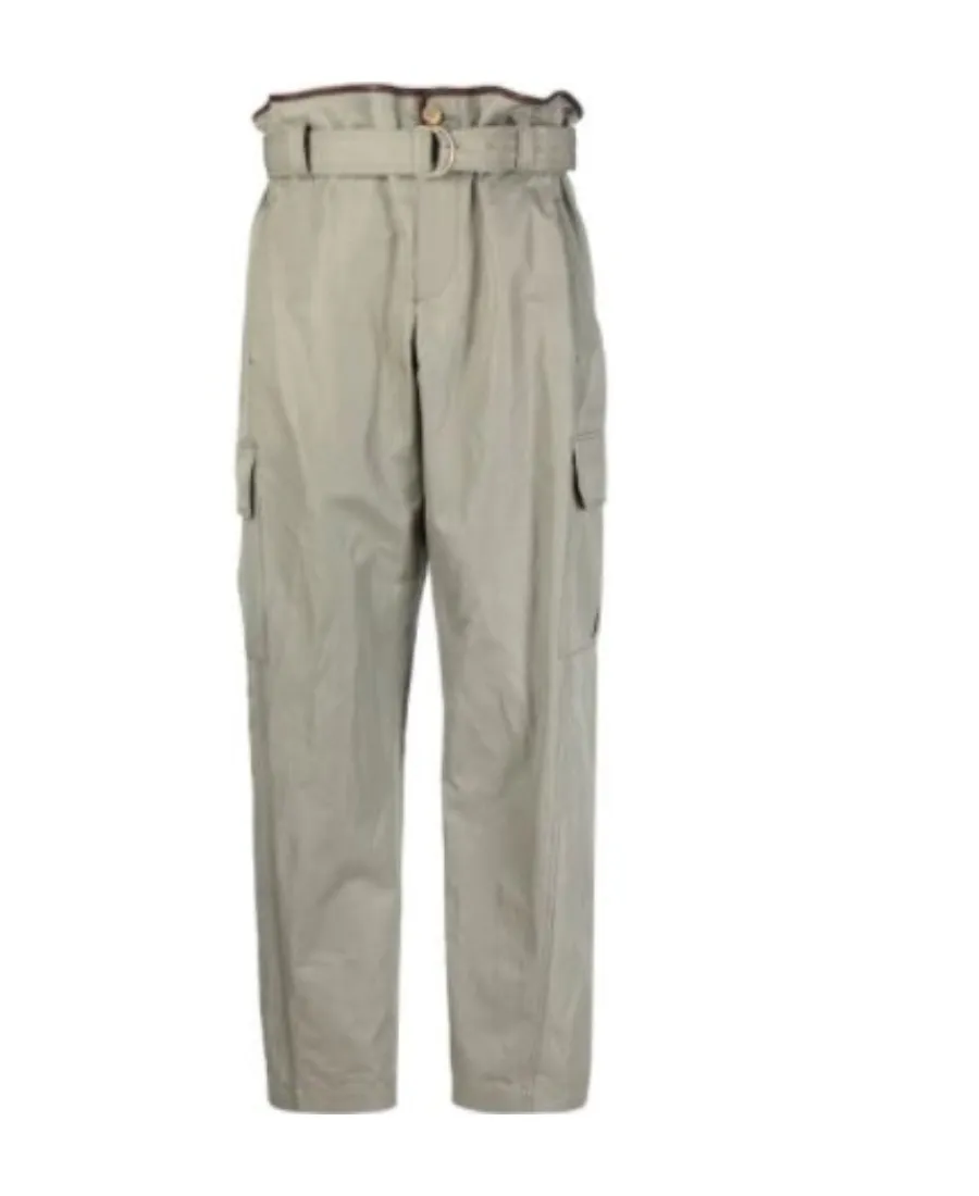 Trousers with a paper bag waistband, front button, belt design, and two flat pockets on both sides.