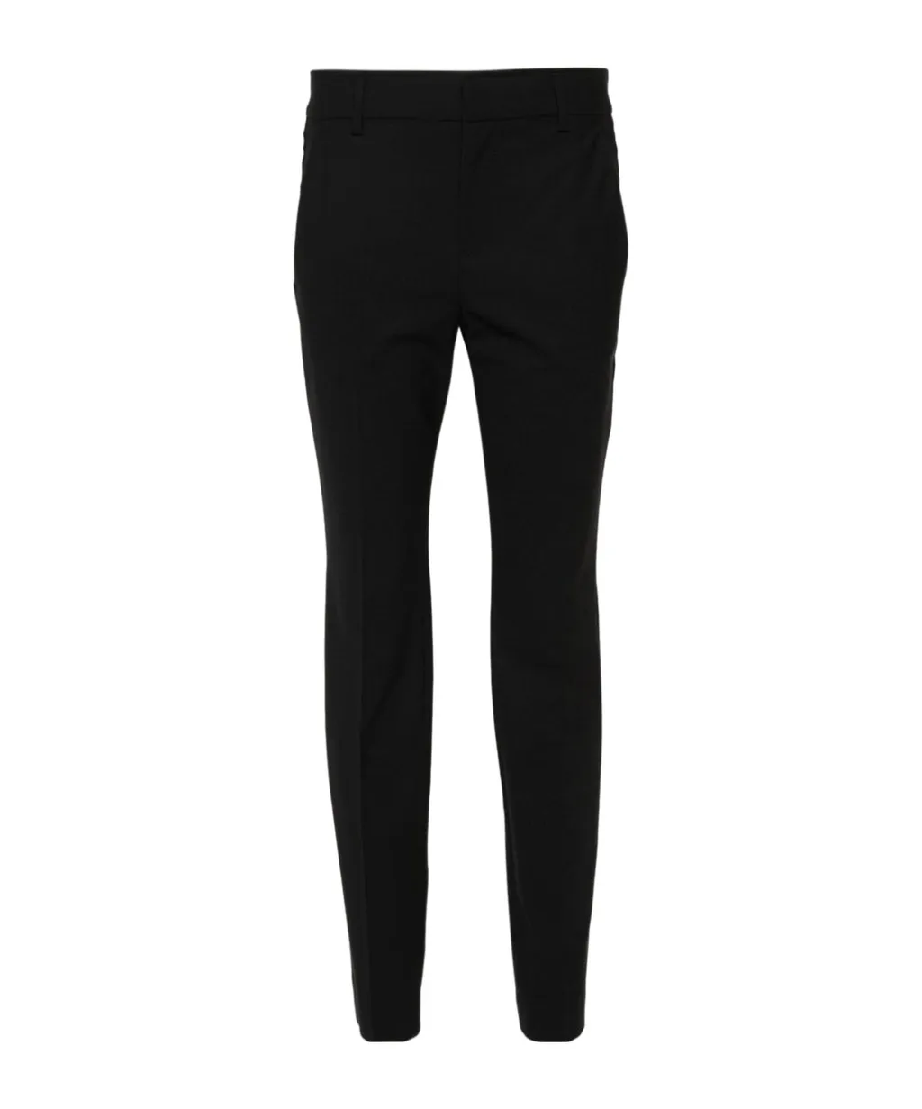 Trousers with belt loops, a pressed crease, two diagonal pockets on both sides, two rear welt pockets, and front invisible buttons, hook buckles, and zipper.
