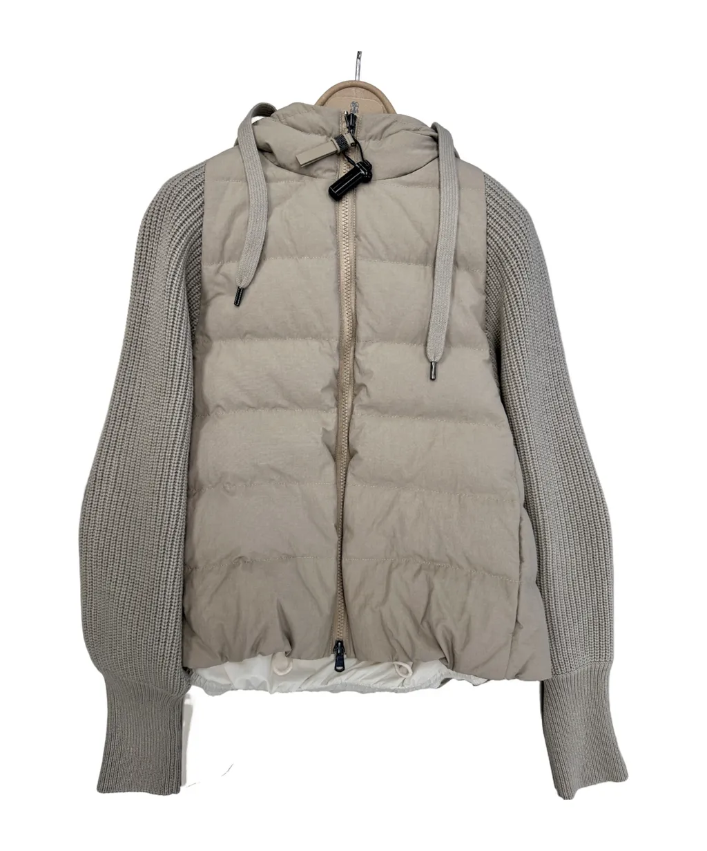Quilted jacket with a hooded neckline, zipper closure, and long knitted sleeves. Features a regular fit.
