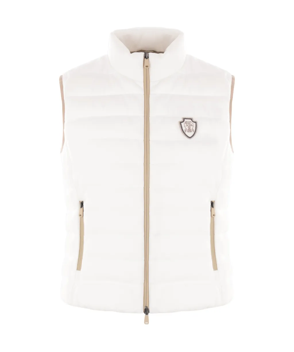 Sleeveless gilet with an upright collar, front zipper opening and closing, and zipper pockets. Features a logo patch.