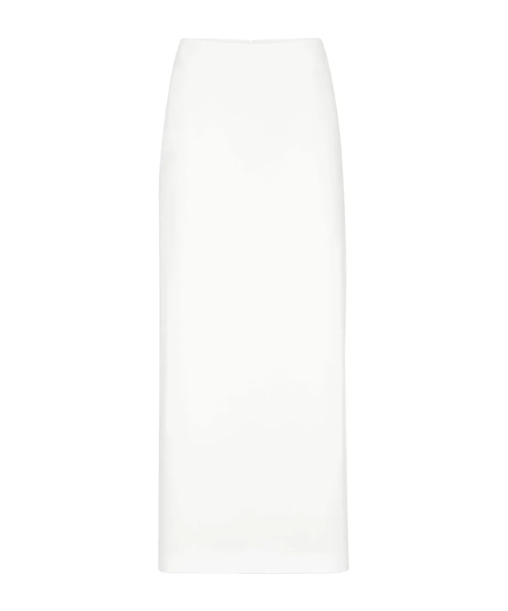 The skirt features a split at the back for movement, a rear zipper closure, and a straight-leg cut. It has a barrel design, is long, and features a high waist.