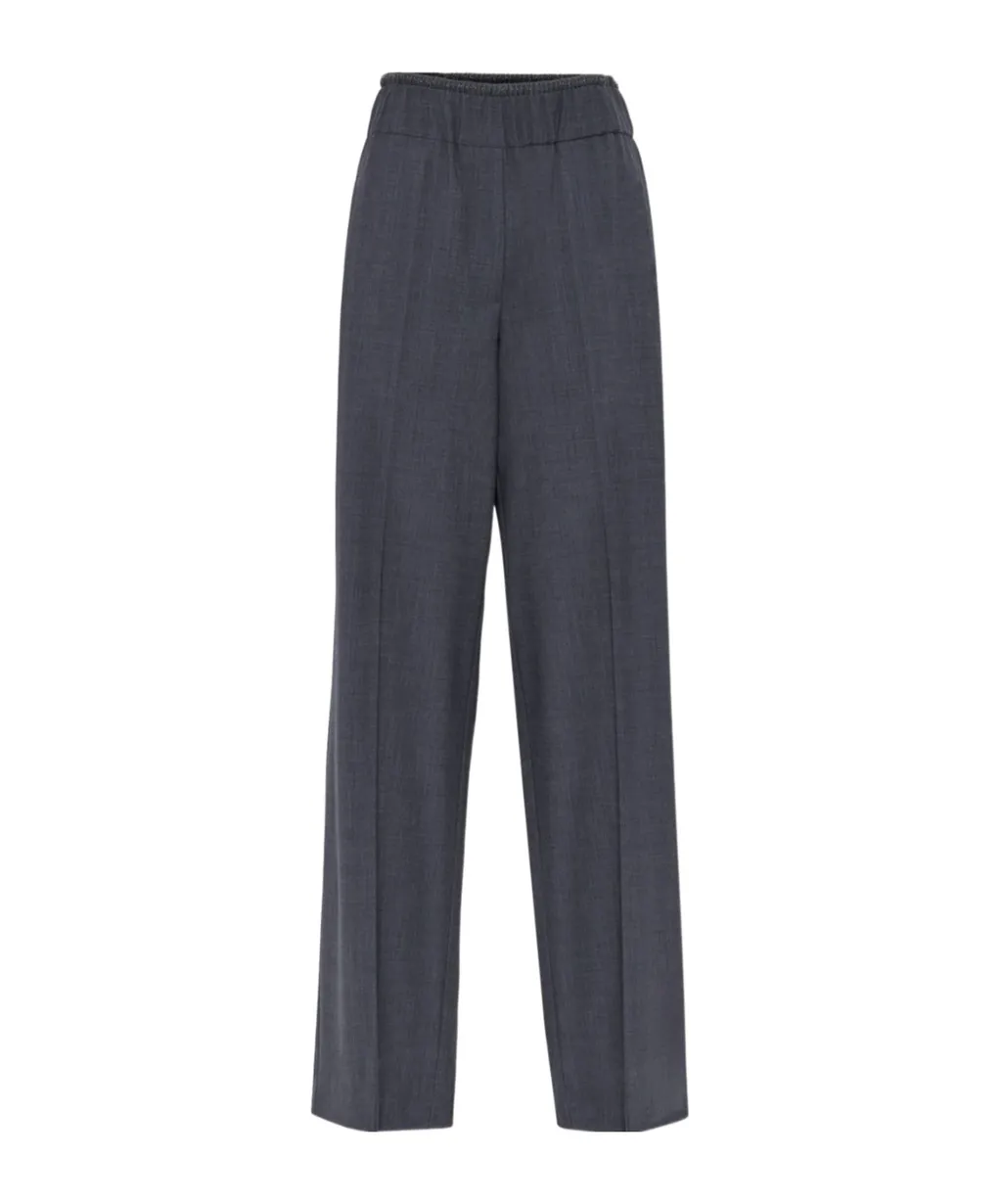 Pants with an elastic waist and ironing details. Features a pocket design.