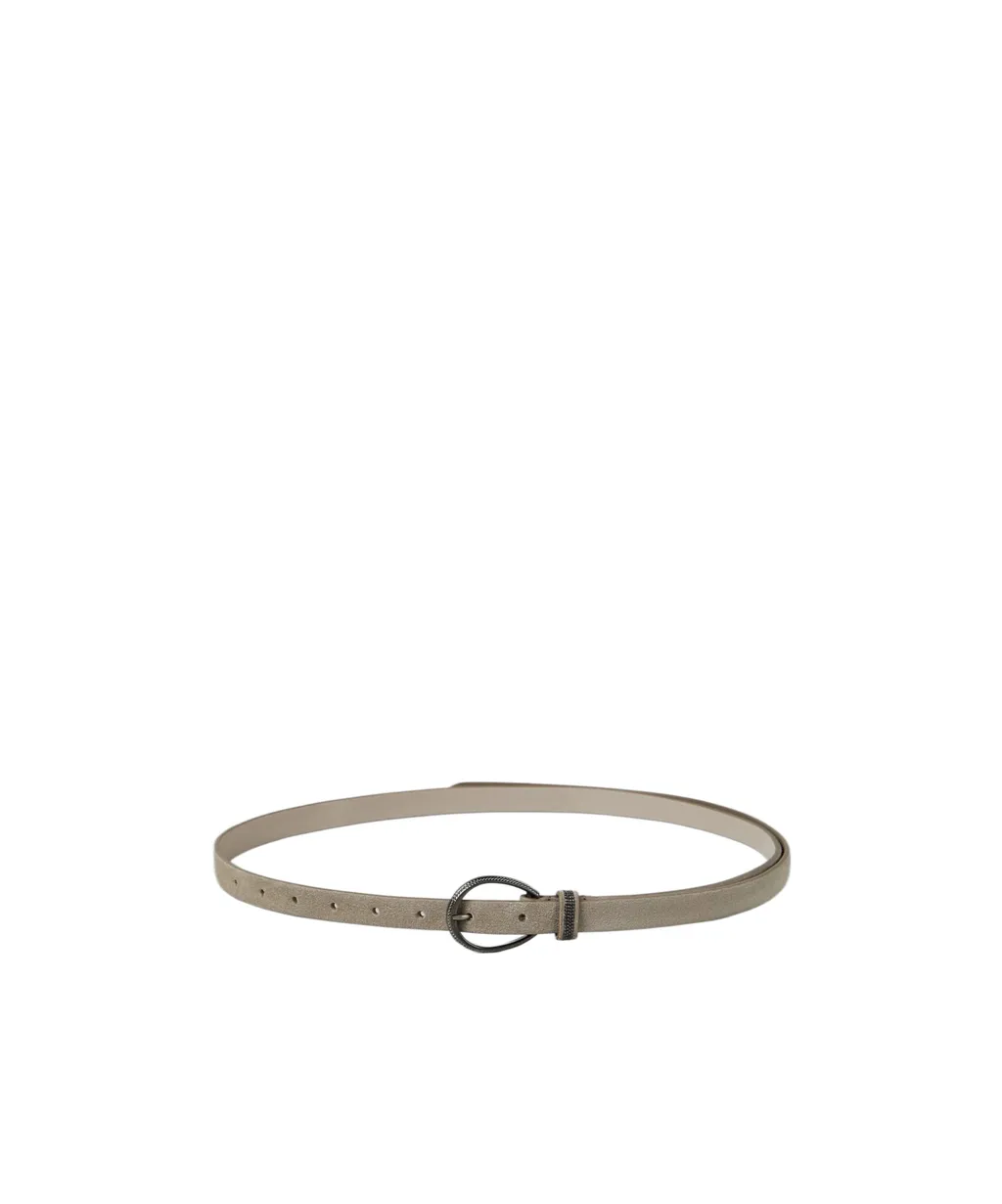 Belt with a mud color, velvet-like texture, and an oversized oval buckle.