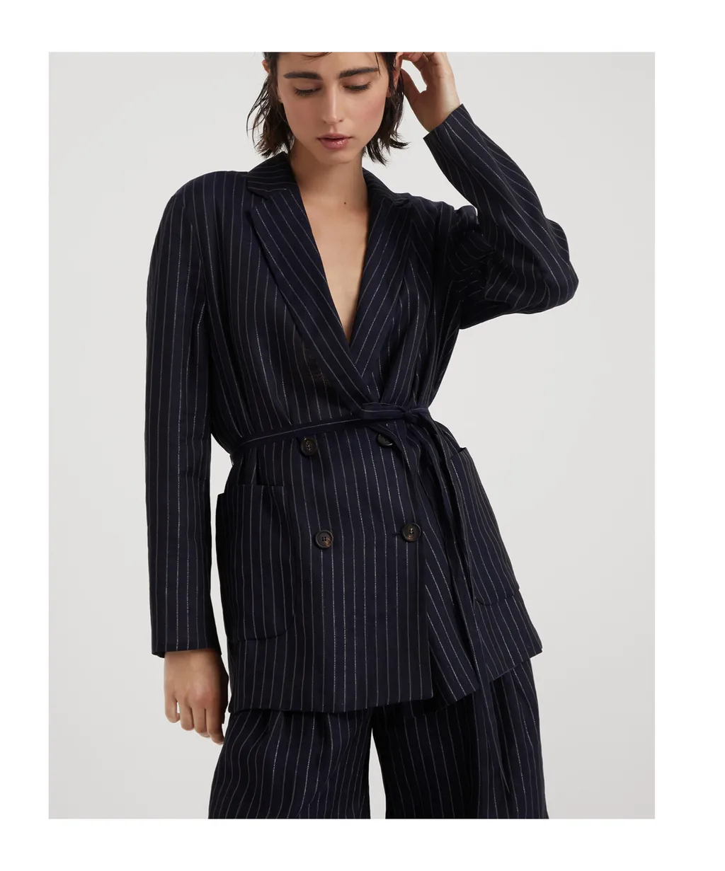 Brunello Cucinelli Pinstripe-Pattern Double Breasted Belted Blazer | Wardatrobe