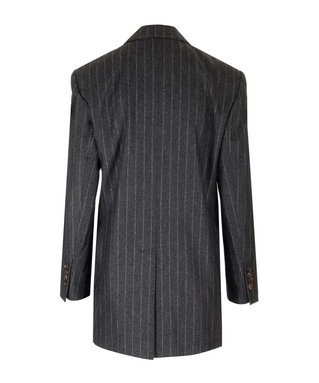 DescriptionSingle-breasted blazer with a pinstripe pattern. Features notched lapels, shoulder pads, long sleeves with buttoned cuffs, a chest welt pocket, two side covered pockets, a rear central vent, and a straight hem. Fully lined with single-row buttons.
