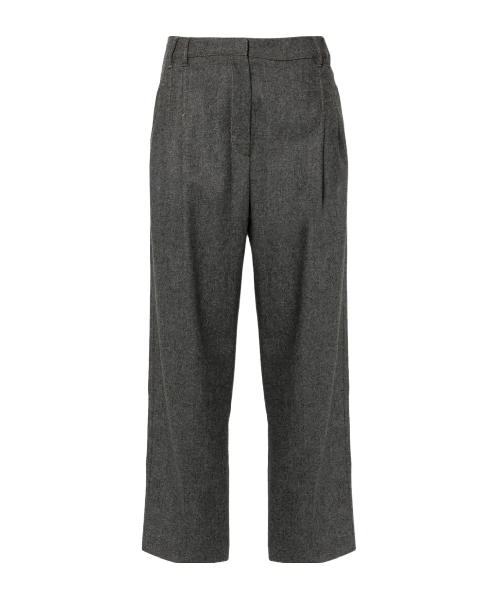 DescriptionH-line (straight) trousers with a regular, medium waist. Features contrast stitching, belt loops, pleated details, pockets on both sides, crimped pleats, two rear pockets, and a front closure with hidden buttons, hooks, and zippers.