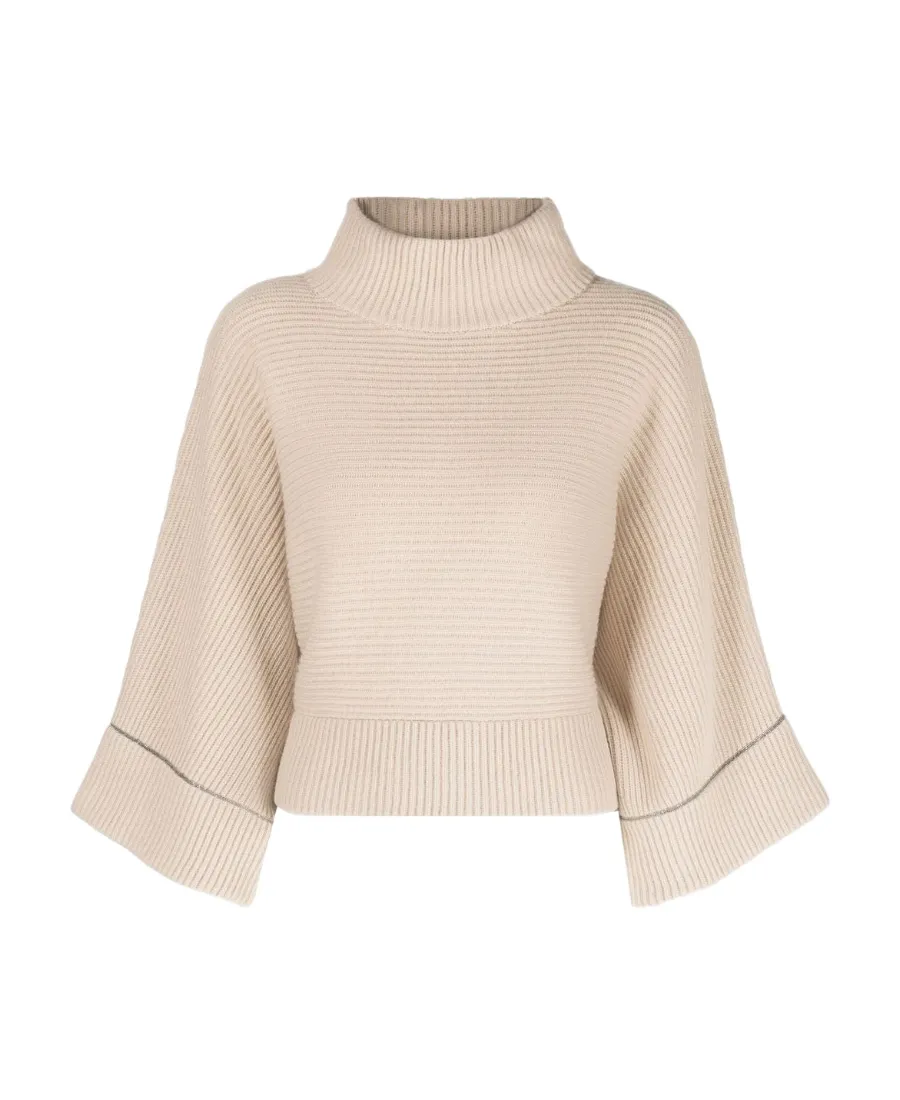 DescriptionThis is a ribbed-knit cashmere sweater featuring a small turtleneck, beaded trim details, three-quarter long draped sleeves, and ribbed edges. It is a pullover with an h-line (straight) and short silhouette.