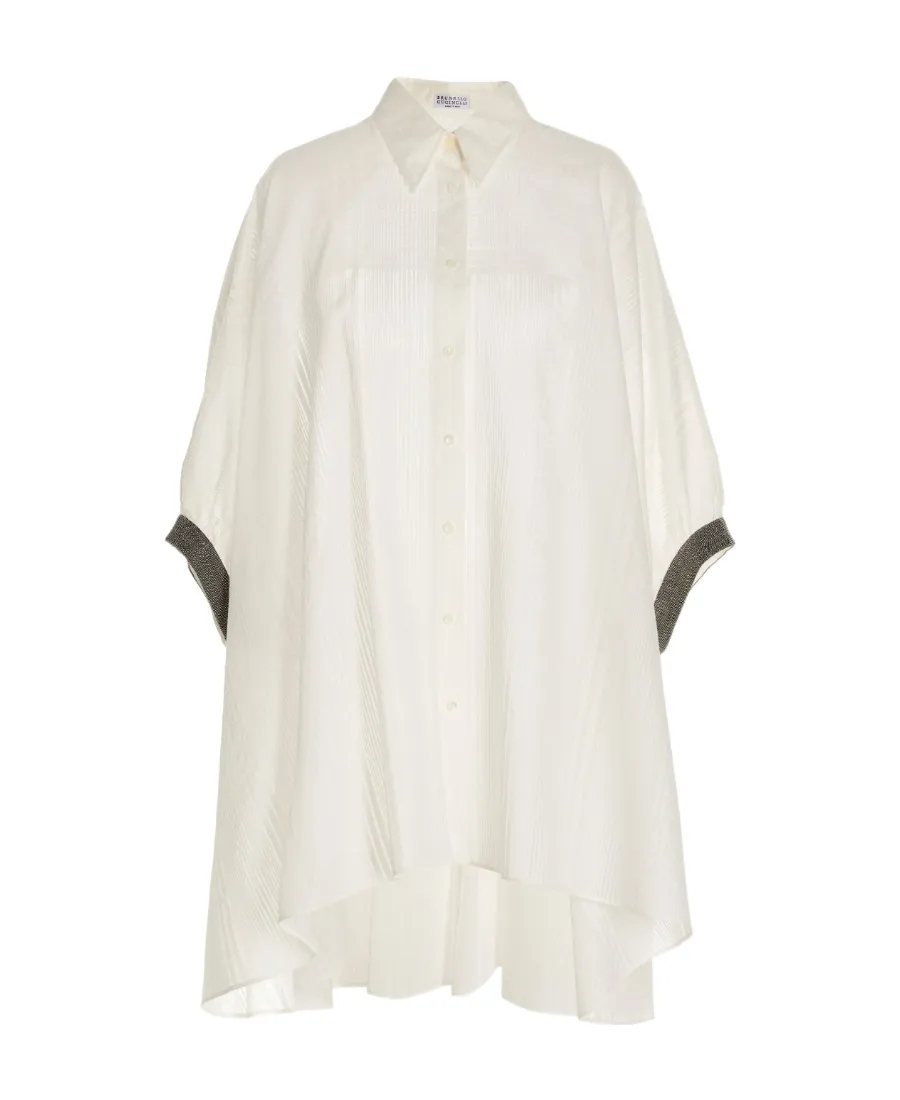 DescriptionShirt with transparent stripes, exquisite cuff decoration, translucent structure, classic collar, and front button opening. Features single row buttons, an oversized silhouette, and a mid-length cut.