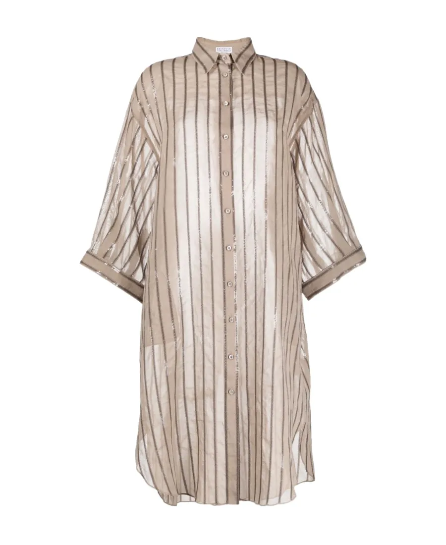 DescriptionThis shirtdress features a vertical stripe pattern with sequin embellishments. It has a front button closure, dropped shoulders, button cuffs, and a curved hem. Designed with single-row buttons.