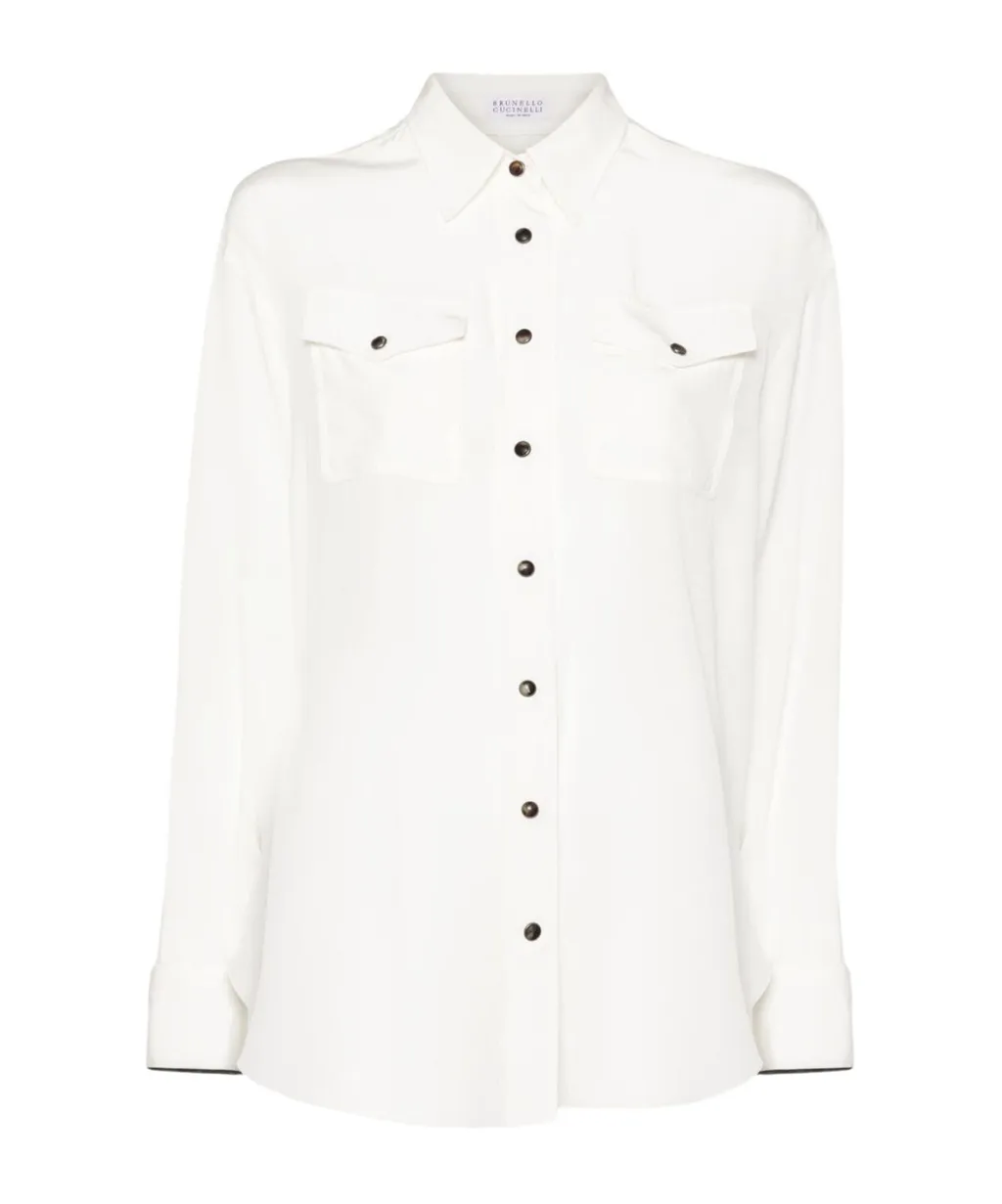 DescriptionThis silk shirt features a classic collar, button cuffs, and long sleeves. It is detailed with an iconic monili chain and a buckle chest pocket. The shirt has a curved hem and fastens with front buttons in a single row.