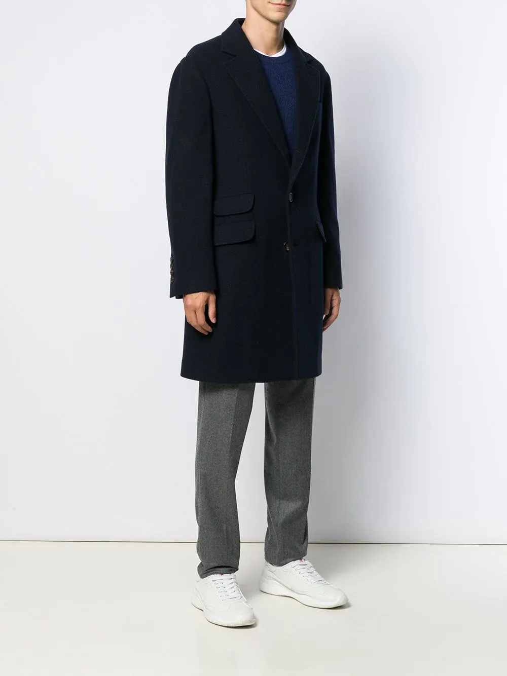 This single-breasted coat features a trapezoidal lapel, front buttons, two front lid pockets, medium length, and two slits on the back. It has single row buttons and a regular, mid-length fit.