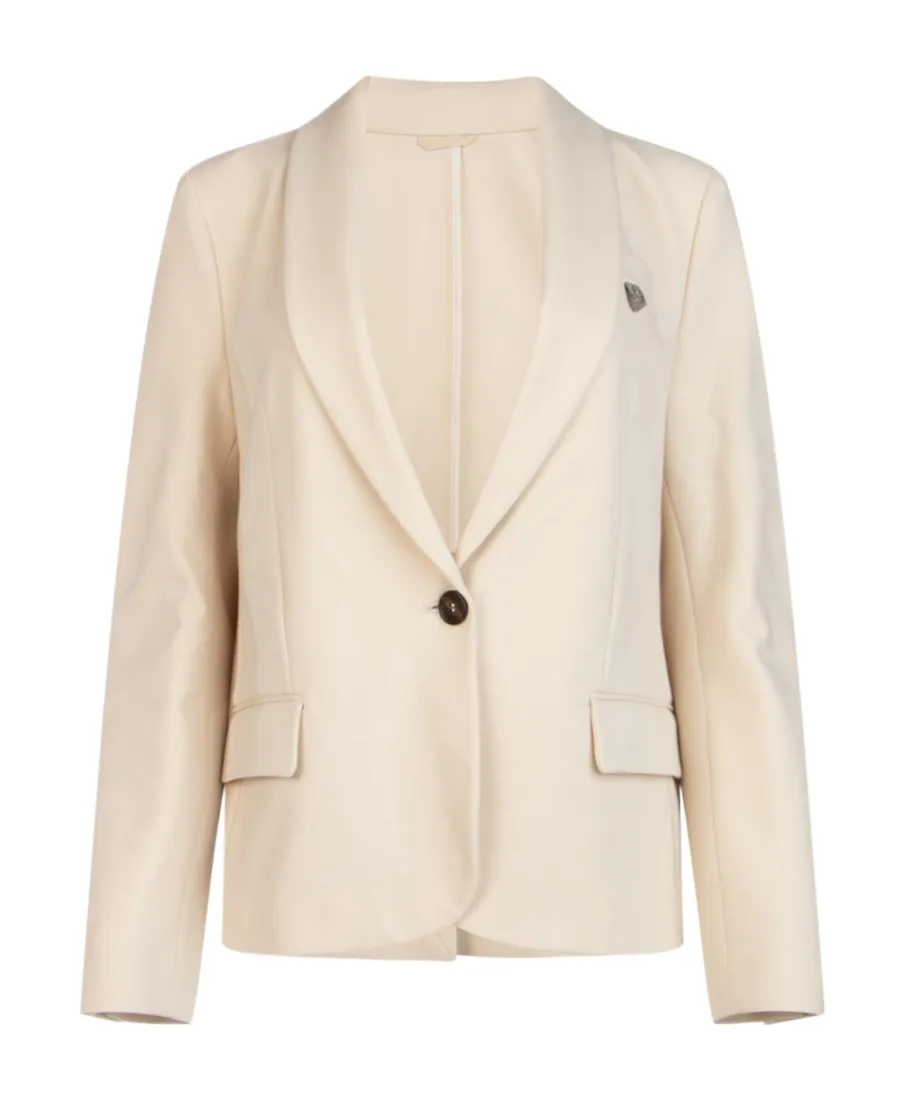 DescriptionCream single-breasted suit jacket with long sleeves, shawl lapel, front button opening and closing, chest flanged pocket, iconic chain details, and two side flip pockets. Features single row buttons.