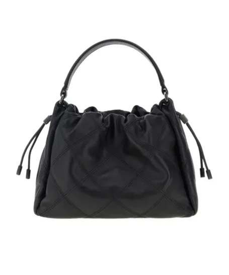 This small handbag features an embossed logo on the front, a fixed handle, and a magnetic buckle closure. It also has side drawcords, monile details, and adjustable, detachable shoulder straps.