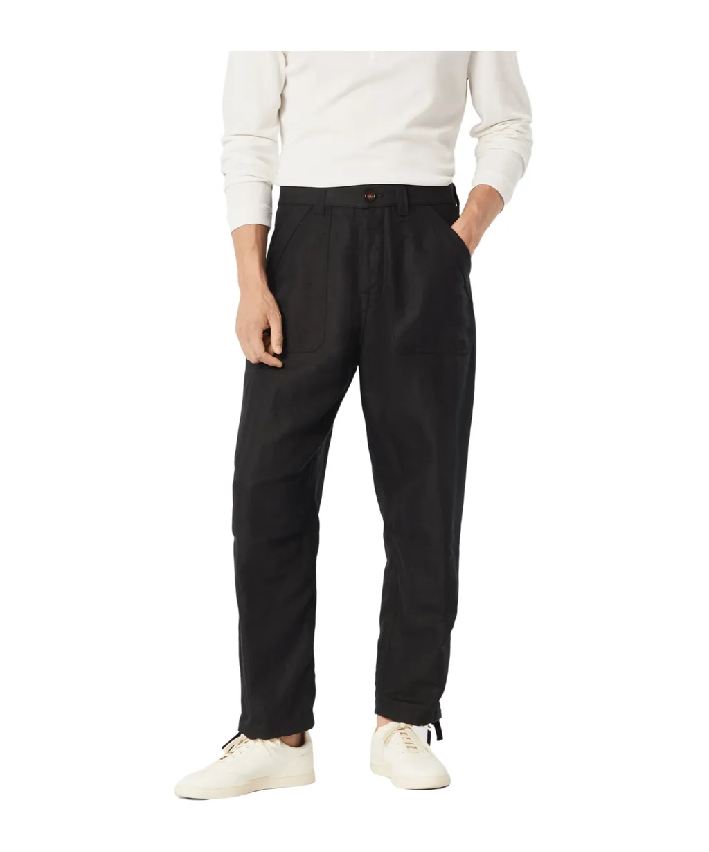 Trousers with a button closure, beveled front pockets, buttoned back pockets, and a drawstring hem. Features a loose fit.