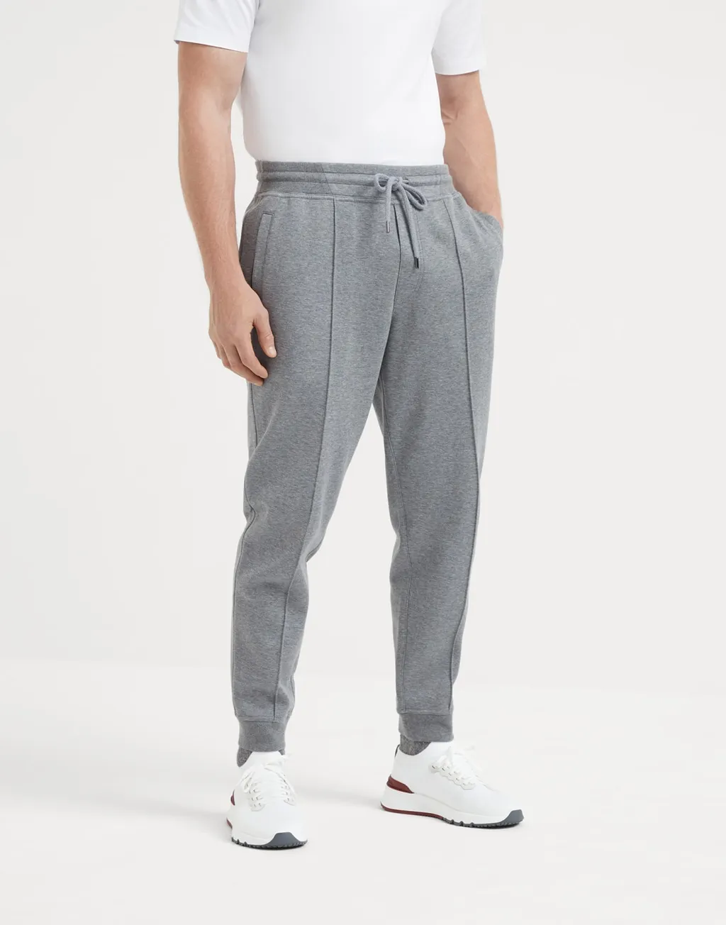 Ribbed knitted waist belt with drawcord, vertical front pocket, ribbed knitted hem, rear welt pockets. Regular fit.