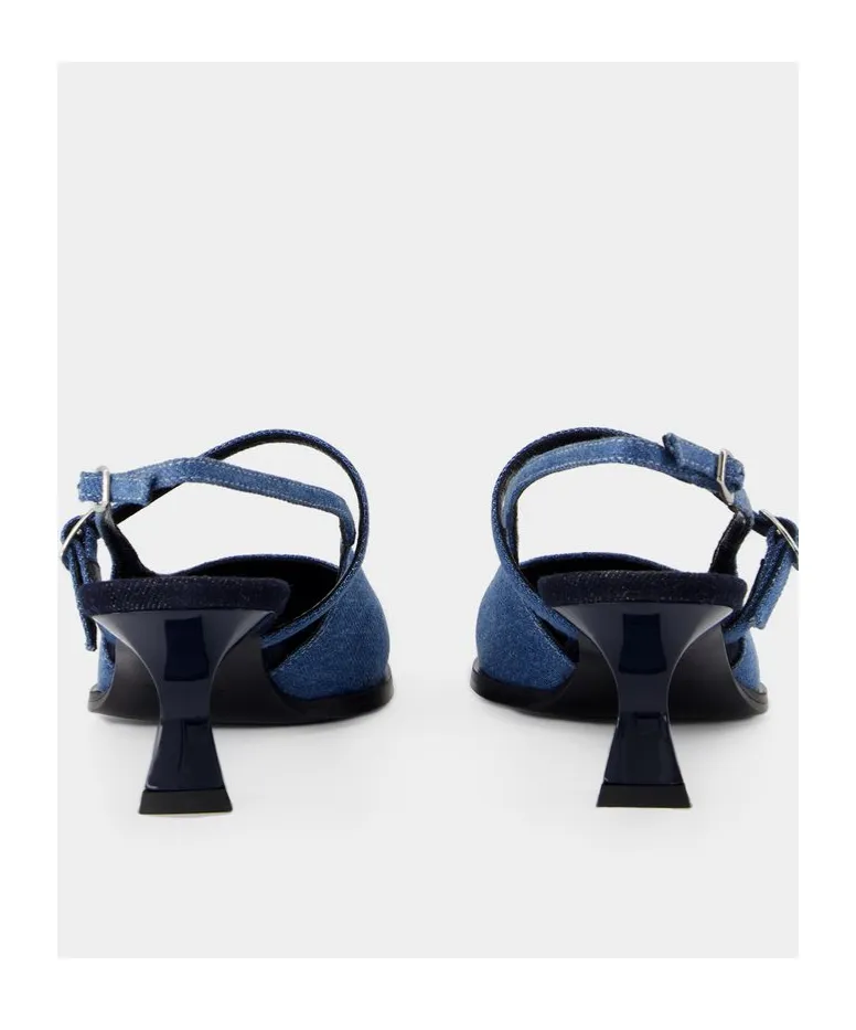 Denim slingback pumps with a pointed toe and flared heel. Features a buckle strap closure and a brand insole. Open heel design.