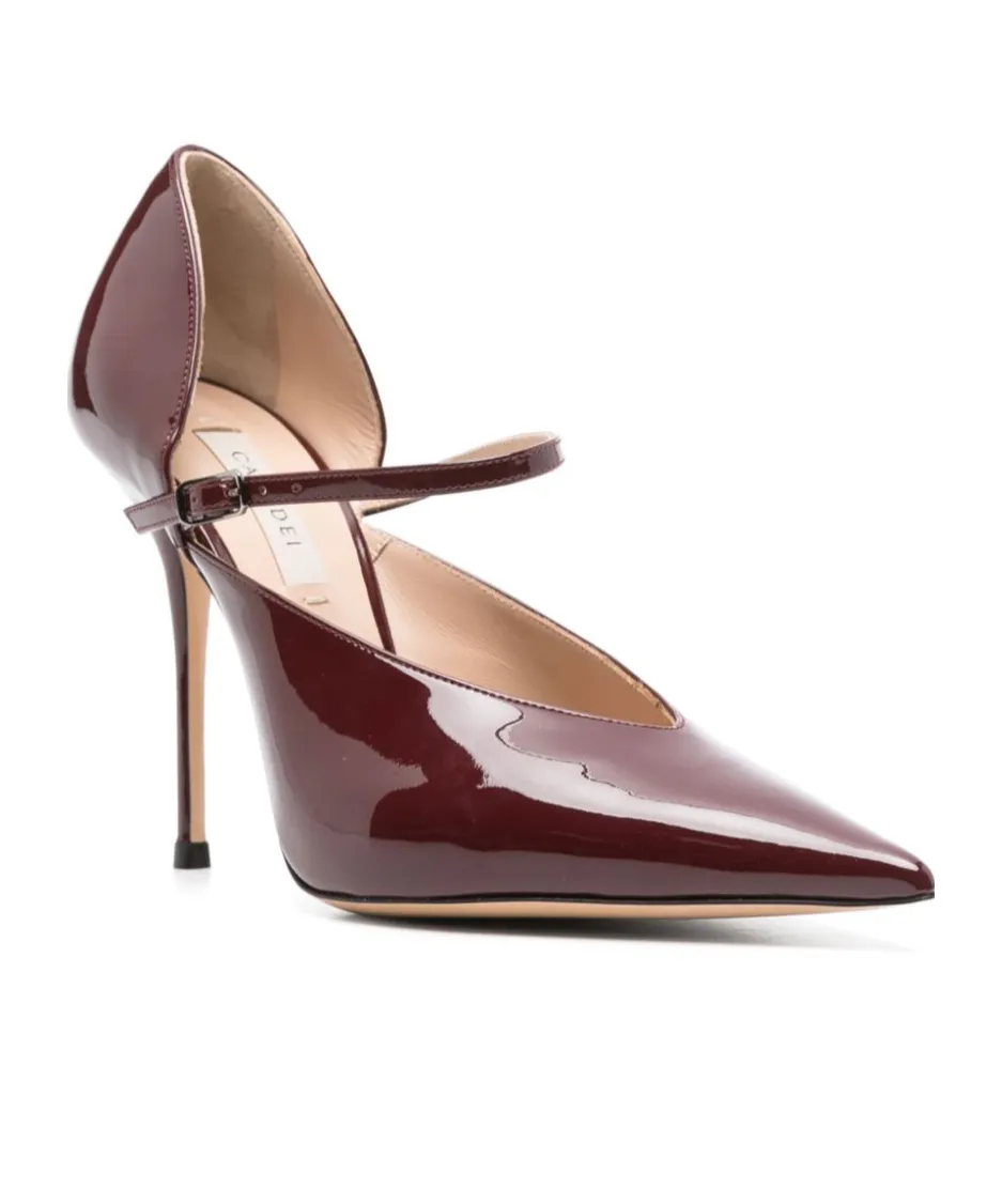 Patent leather pumps with a pointed toe and a thin stiletto heel. Features a delicate ankle strap with a buckle closure.