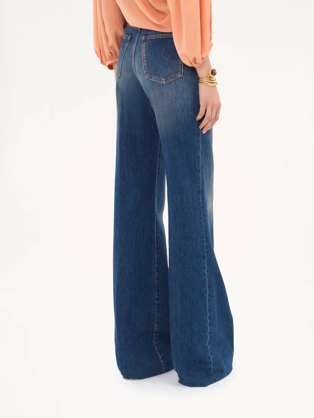 DescriptionHigh-waisted flared jeans with front zipper and button closure engraved with a chloé pattern. Features three mini flip pockets at the waist, a back pocket, belt loops, and a chloé leather patch on the back.