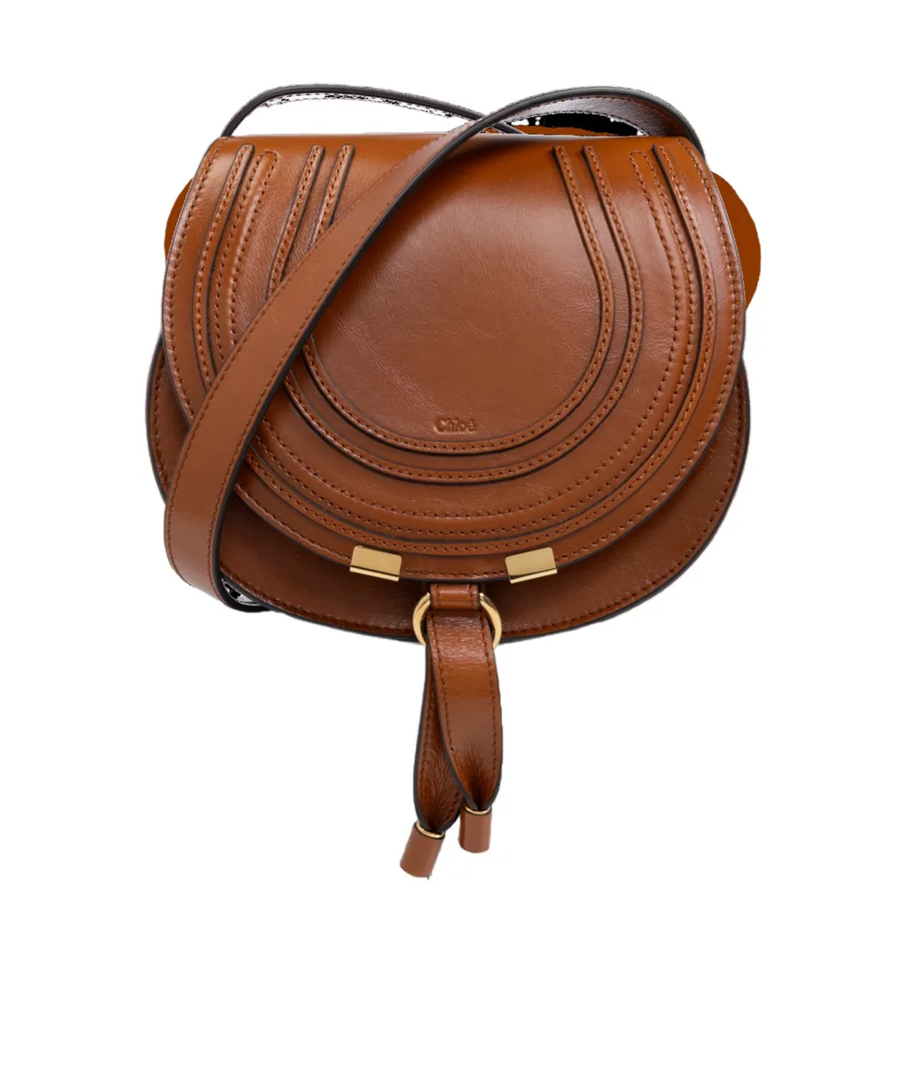 DescriptionThis small saddle bag features a round shape, gold-tone metal details, and the chloé logo on the front. It has an adjustable long shoulder strap and a practical internal compartment for cards.