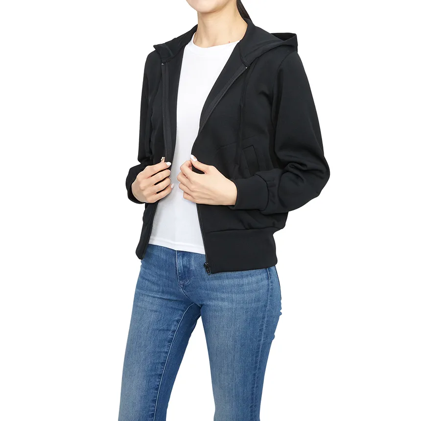 Long sleeves, hooded, elastic cuffs and hem. Zipper.