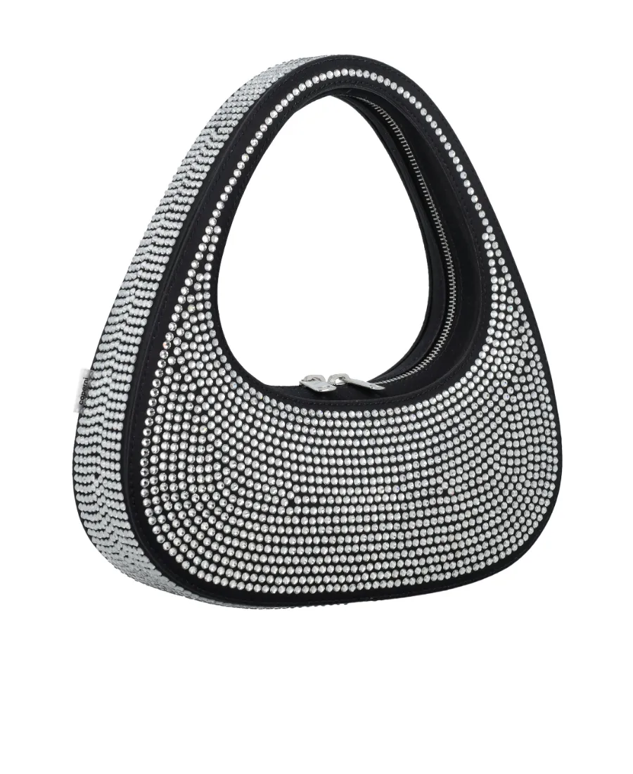 Zippered handbag with an integrated handle and a two-way zipper opening and closing. Features crystal embellishment.
