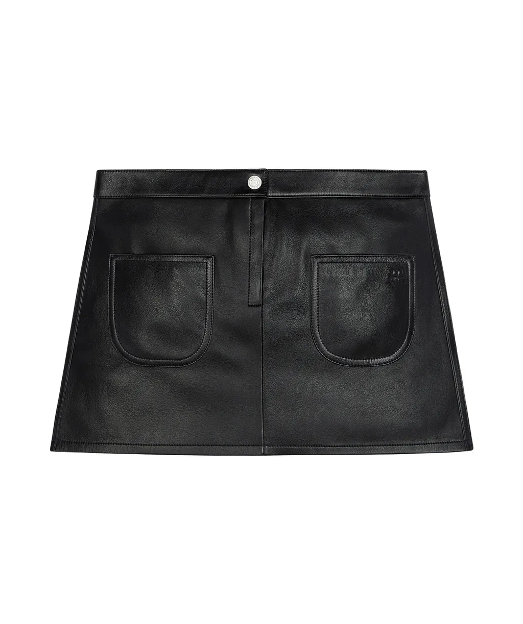 Skirt decorated with a logo, two front patch pockets, and a front snap closure.