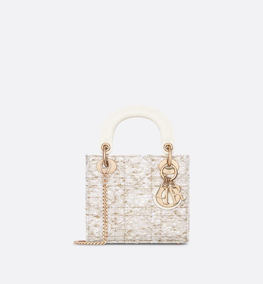 DescriptionPart of the dior or capsule, this miniature lady dior bag is crafted in white tweed with a gold-tone metallic cannage motif. It features pale gold-finish metal d.i.o.r. Charms and a removable chain strap. This bag can be carried by hand or worn crossbody.