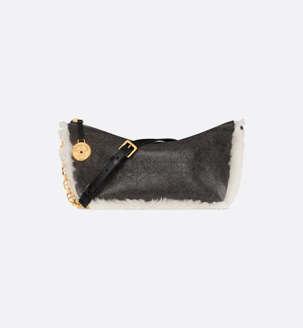 DescriptionBlack aged effect lambskin and ecru merino wool hobo bag with a supple silhouette. Features macrocannage topstitching, a zip closure with a christian dior paris signature and star engraved medallion, and discreet cd studs on the sides. Includes one compartment, one slip pocket, four card slots, and an adjustable chain link strap with a leather insert.